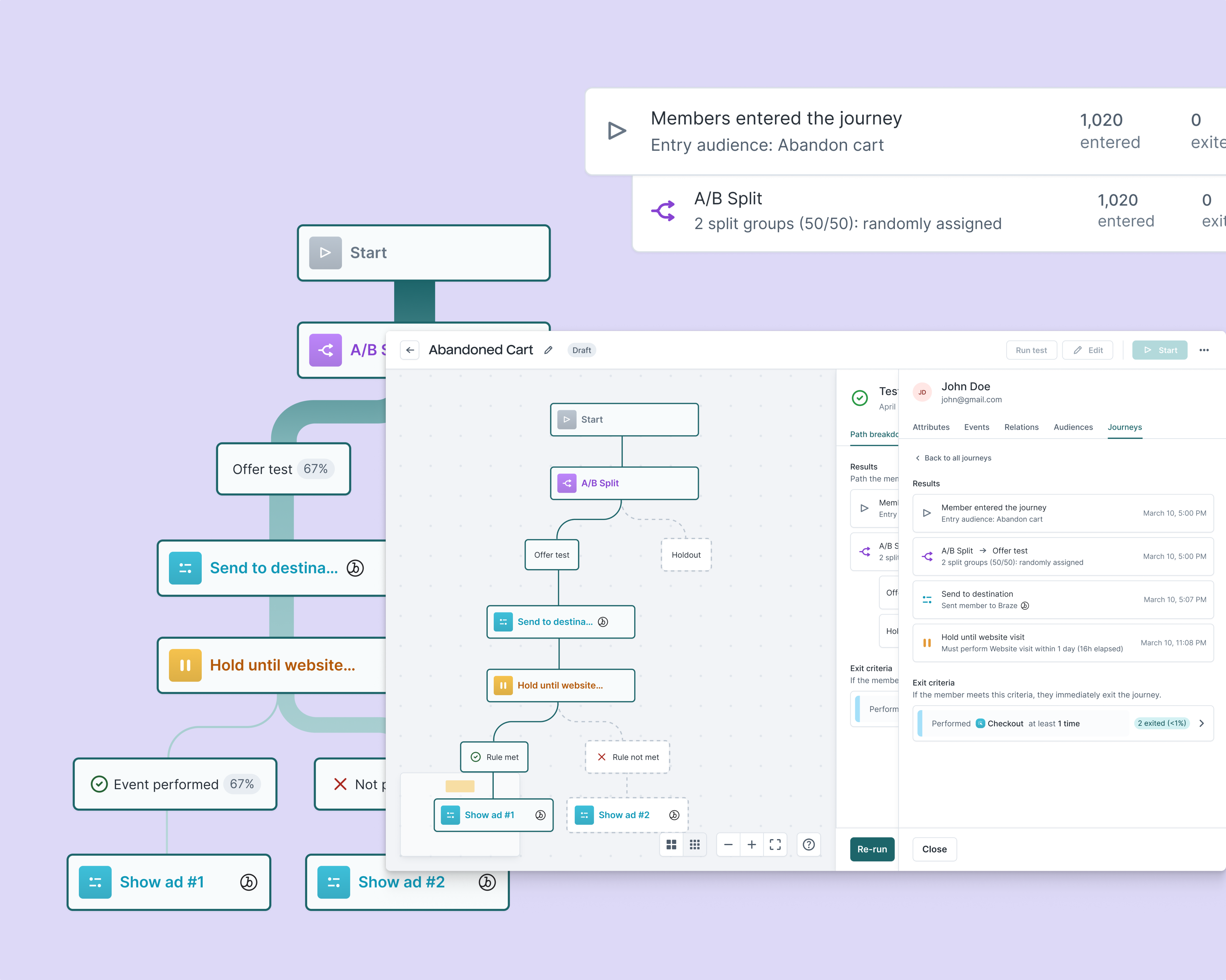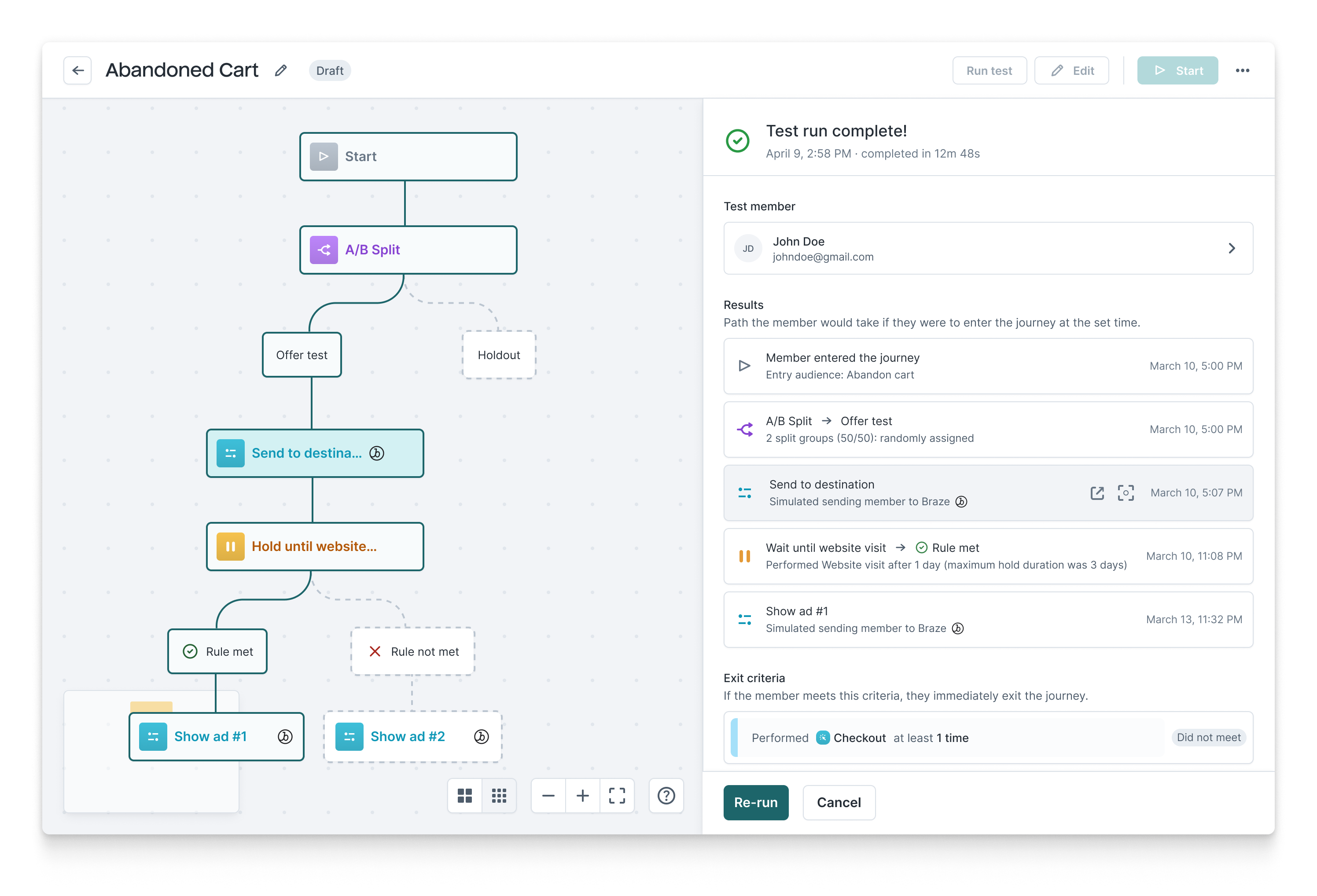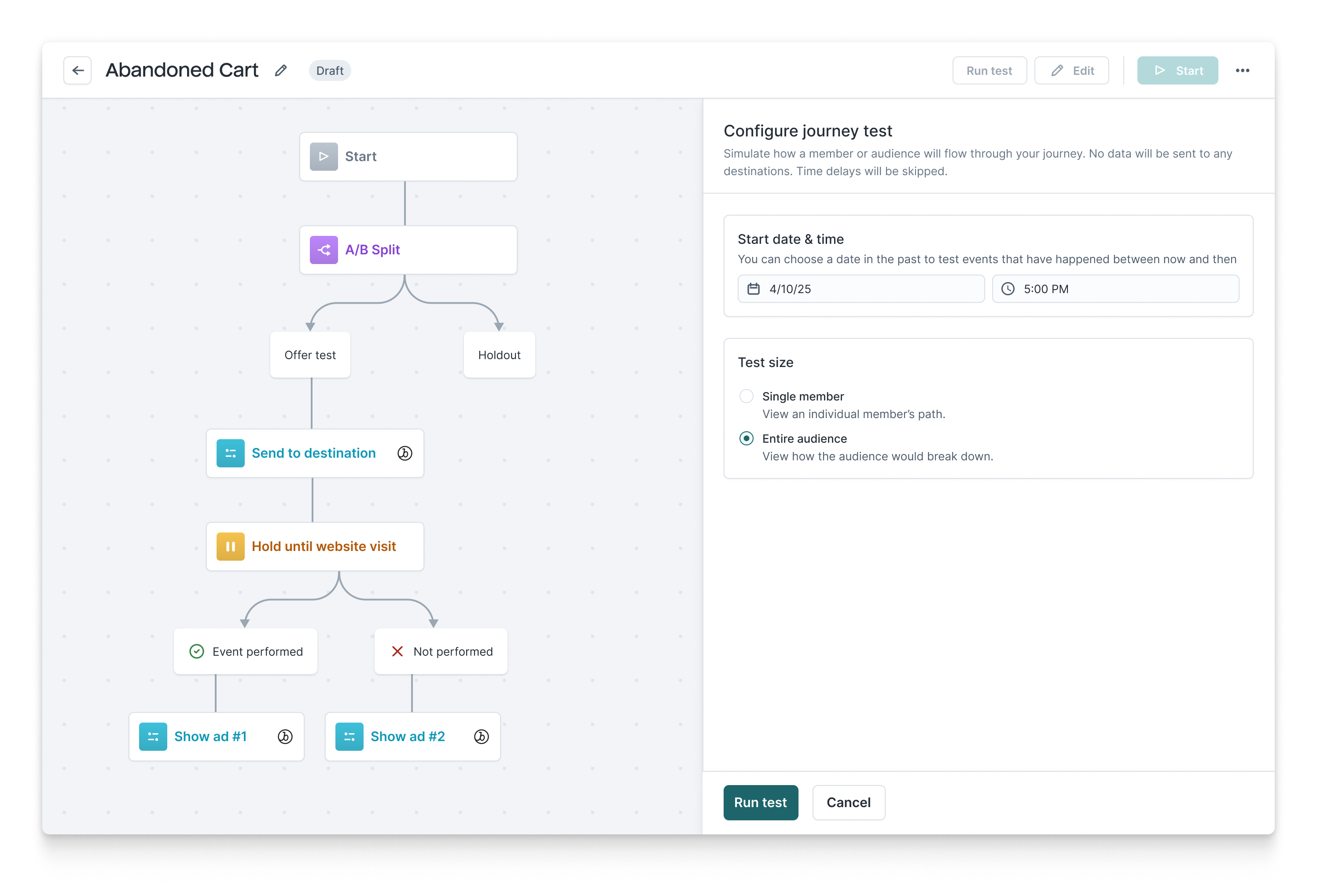 I led research and design for a new journeys feature that allows customers to simulate a journey run safely with test data before going live.